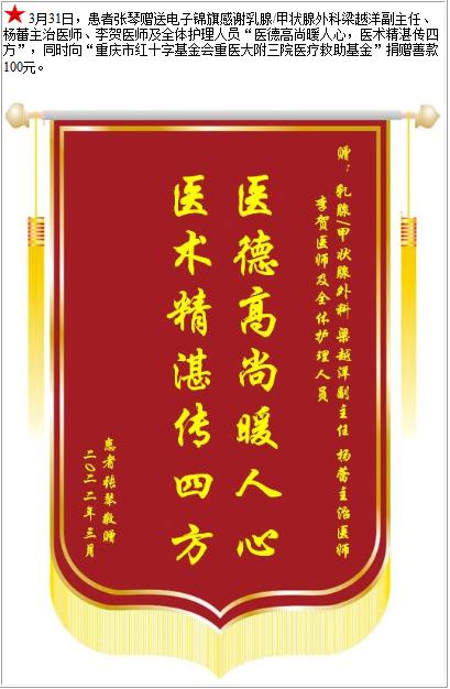 患者张琴赠送电子锦旗感谢乳腺/甲状腺外科梁越洋副主任等人及全体护理人员,并向医疗救助基金捐赠善款100元-锦旗-患者心声-患者服务-重庆医科大学附属第三医院【官方网站】