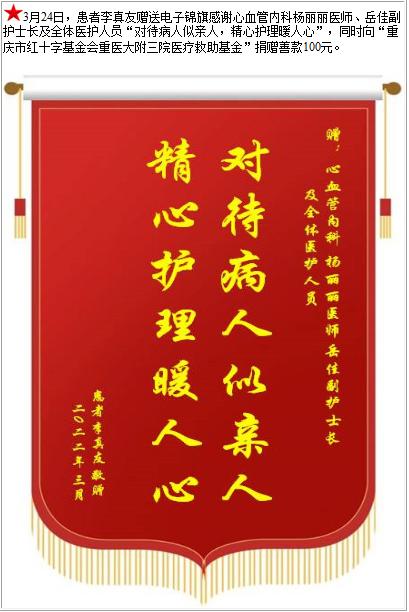 患者李真友赠送电子锦旗感谢心血管内科杨丽丽医师等人及全体医护人员,并向医疗救助基金捐赠善款100元-锦旗-患者心声-患者服务-重庆医科大学附属第三医院【官方网站】