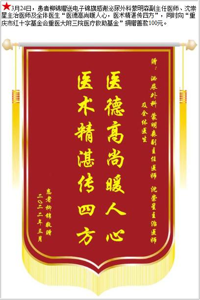 患者柳锦赠送电子锦旗感谢泌尿外科蒙明森副主任医师等人及全体医生,并向医疗救助基金捐赠善款100元-锦旗-患者心声-患者服务-重庆医科大学附属第三医院【官方网站】