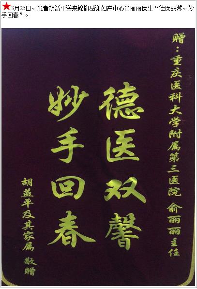 患者胡益平送来锦旗感谢妇产中心俞丽丽医生“德医双馨,妙手回春”-锦旗-患者心声-患者服务-重庆医科大学附属第三医院【官方网站】