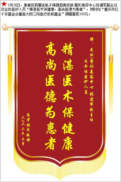 患者张莉赠送电子锦旗感谢皮肤/整形美容中心张道军副主任及全体医护人员,并向医疗救助基金捐赠善款100元-锦旗-患者心声-患者服务-重庆医科大学附属第三医院【官方网站】