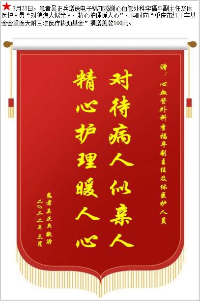 患者吴正兵赠送电子锦旗感谢心血管外科李福平副主任及体医护人员,并向医疗救助基金捐赠善款100元-锦旗-患者心声-患者服务-重庆医科大学附属第三医院【官方网站】