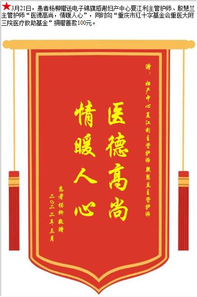 患者杨柳赠送电子锦旗感谢妇产中心夏江利主管护师等人,并向医疗救助基金捐赠善款100元-锦旗-患者心声-患者服务-重庆医科大学附属第三医院【官方网站】