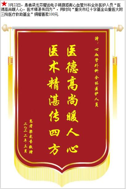 患者梁龙芬赠送电子锦旗感谢心血管外科全体医护人员,并向医疗救助基金捐赠善款100元-锦旗-患者心声-患者服务-重庆医科大学附属第三医院【官方网站】