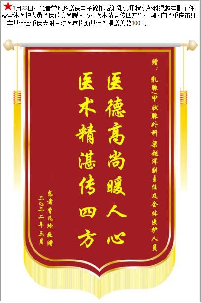 患者曾凡玲赠送电子锦旗感谢乳腺/甲状腺外科梁越洋副主任及全体医护人员,并向医疗救助基金捐赠善款100元-锦旗-患者心声-患者服务-重庆医科大学附属第三医院【官方网站】