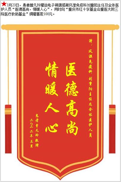 患者曾凡玲赠送电子锦旗感谢风湿免疫科刘重阳主任及全体医护人员,并向医疗救助基金捐赠善款100元-锦旗-患者心声-患者服务-重庆医科大学附属第三医院【官方网站】