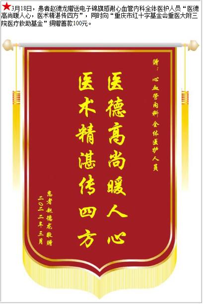 患者赵德龙赠送电子锦旗感谢心血管内科全体医护人员,并向医疗救助基金捐赠善款100元-锦旗-患者心声-患者服务-重庆医科大学附属第三医院【官方网站】
