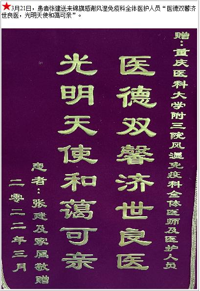 患者张建送来锦旗感谢风湿免疫科全体医护人员“医德双馨济世良医,光明天使和蔼可亲”-锦旗-患者心声-患者服务-重庆医科大学附属第三医院【官方网站】