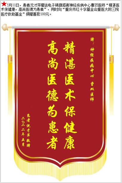 患者沈才萍赠送电子锦旗感谢神经疾病中心曹双医师,并向医疗救助基金捐赠善款100元-锦旗-患者心声-患者服务-重庆医科大学附属第三医院【官方网站】