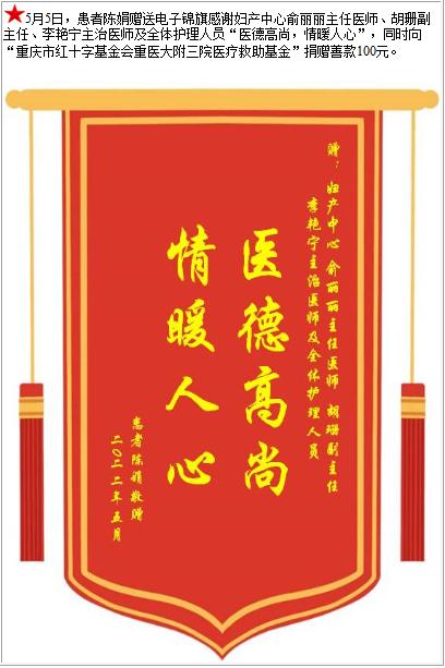 患者陈娟赠送电子锦旗感谢妇产中心俞丽丽主任医师等人及全体护理人员,并向医疗救助基金捐赠善款100元-锦旗-患者心声-患者服务-重庆医科大学附属第三医院【官方网站】