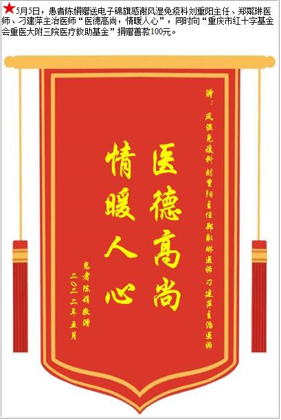 患者陈娟赠送电子锦旗感谢风湿免疫科刘重阳主任等人,并向医疗救助基金捐赠善款100元-锦旗-患者心声-患者服务-重庆医科大学附属第三医院【官方网站】