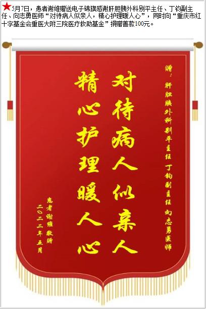 患者谢维赠送电子锦旗感谢肝胆胰外科别平主任等人,并向医疗救助基金捐赠善款100元-锦旗-患者心声-患者服务-重庆医科大学附属第三医院【官方网站】