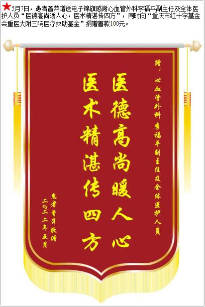 患者曾萍赠送电子锦旗感谢心血管外科李福平副主任及全体医护人员,并向医疗救助基金捐赠善款100元-锦旗-患者心声-患者服务-重庆医科大学附属第三医院【官方网站】