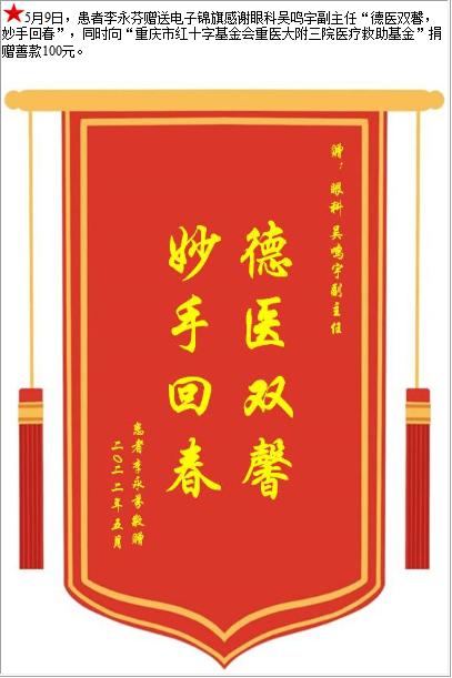 患者李永芬赠送电子锦旗感谢眼科吴鸣宇副主任,并向医疗救助基金捐赠善款100元-锦旗-患者心声-患者服务-重庆医科大学附属第三医院【官方网站】