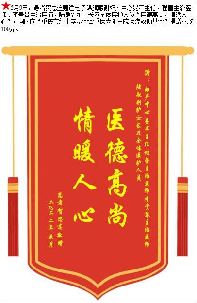 患者贺思连赠送电子锦旗感谢妇产中心易萍主任等人及全体医护人员,并向医疗救助基金捐赠善款100元-锦旗-患者心声-患者服务-重庆医科大学附属第三医院【官方网站】