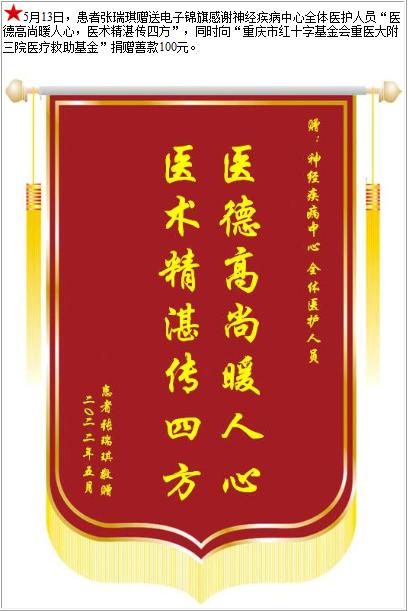 患者张瑞琪赠送电子锦旗感谢神经疾病中心全体医护人员,并向医疗救助基金捐赠善款100元-锦旗-患者心声-患者服务-重庆医科大学附属第三医院【官方网站】