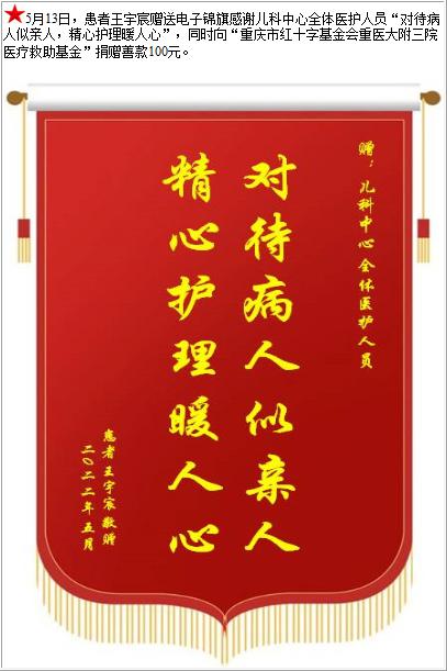 患者王宇宸赠送电子锦旗感谢儿科中心全体医护人员,并向医疗救助基金捐赠善款100元-锦旗-患者心声-患者服务-重庆医科大学附属第三医院【官方网站】
