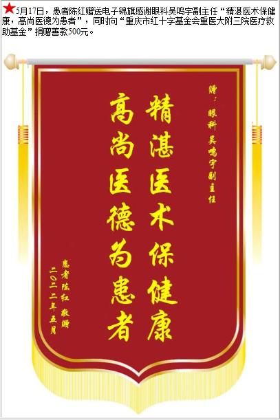 患者陈红赠送电子锦旗感谢眼科吴鸣宇副主任,并向医疗救助基金捐赠善款500元-锦旗-患者心声-患者服务-重庆医科大学附属第三医院【官方网站】