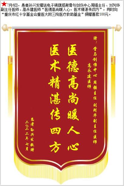 患者孙兴发赠送电子锦旗感谢骨与创伤中心周强主任等人,并向医疗救助基金捐赠善款100元-锦旗-患者心声-患者服务-重庆医科大学附属第三医院【官方网站】