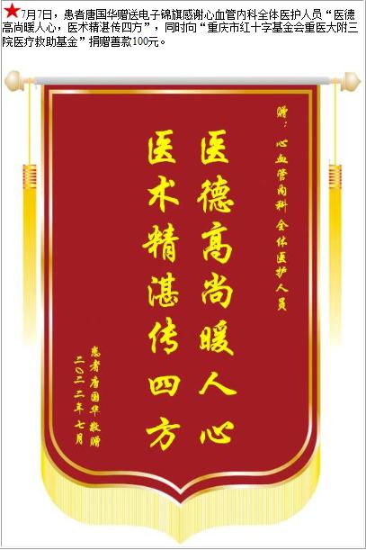 患者唐国华赠送电子锦旗感谢心血管内科全体医护人员,并向医疗救助基金捐赠善款100元-锦旗-患者心声-患者服务-重庆医科大学附属第三医院【官方网站】