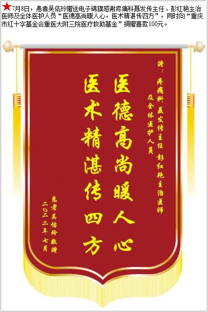 患者吴佑玲赠送电子锦旗感谢疼痛科聂发传主任等人及全体医护人员,并向医疗救助基金捐赠善款100元-锦旗-患者心声-患者服务-重庆医科大学附属第三医院【官方网站】