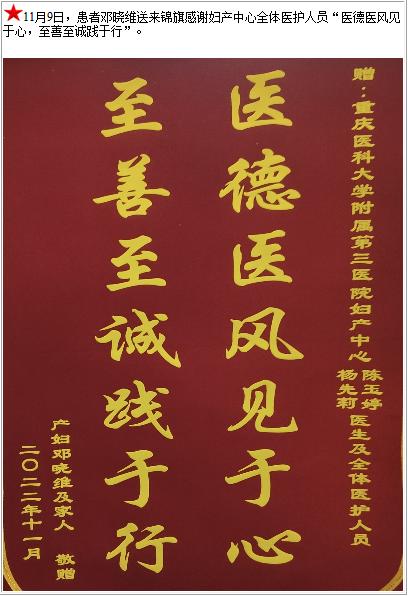 患者邓晓维送来锦旗感谢妇产中心全体医护人员“医德医风见于心,至善至诚践于行”-锦旗-患者心声-患者服务-重庆医科大学附属第三医院【官方网站】