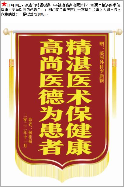 患者何桂福赠送电子锦旗感谢泌尿外科李新颖,并向医疗救助基金捐赠善款100元-锦旗-患者心声-患者服务-重庆医科大学附属第三医院【官方网站】