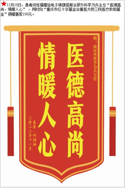 患者何桂福赠送电子锦旗感谢泌尿外科李为兵主任 ,并向医疗救助基金捐赠善款100元-锦旗-患者心声-患者服务-重庆医科大学附属第三医院【官方网站】