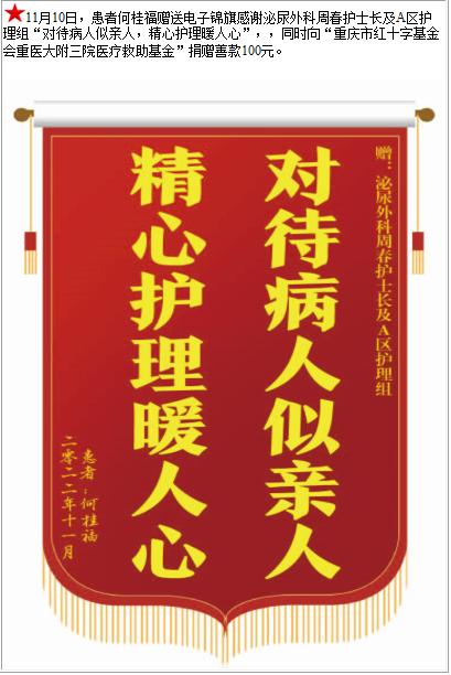 患者何桂福赠送电子锦旗感谢泌尿外科周春护士长及A区护理组,并向医疗救助基金捐赠善款100元-锦旗-患者心声-患者服务-重庆医科大学附属第三医院【官方网站】