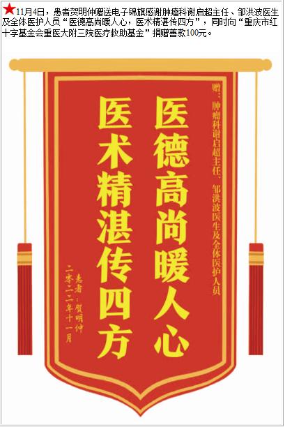 患者贺明仲赠送电子锦旗感谢肿瘤科谢启超主任等人及全体医护人员,并向医疗救助基金捐赠善款100元-锦旗-患者心声-患者服务-重庆医科大学附属第三医院【官方网站】