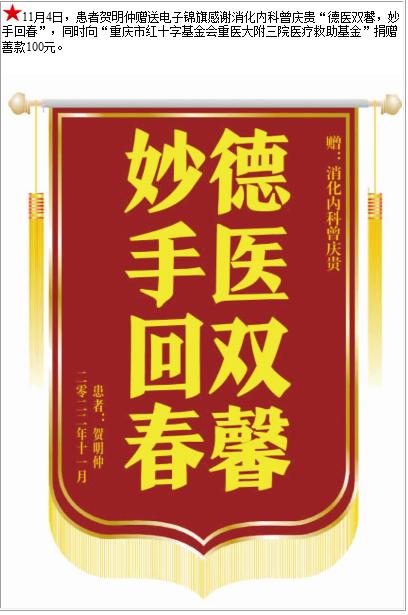 患者贺明仲赠送电子锦旗感谢消化内科曾庆贵,并向医疗救助基金捐赠善款100元-锦旗-患者心声-患者服务-重庆医科大学附属第三医院【官方网站】