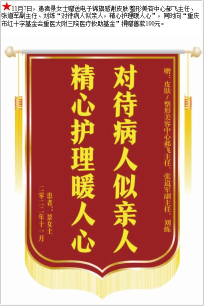 患者景女士赠送电子锦旗感谢皮肤/整形美容中心郝飞主任等人,并向医疗救助基金捐赠善款100元-锦旗-患者心声-患者服务-重庆医科大学附属第三医院【官方网站】