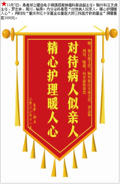 患者郑立赠送电子锦旗感谢肿瘤科谢启超主任;胸外科汪天虎主任等人;内分泌科秦思,并向医疗救助基金捐赠善款1000元-锦旗-患者心声-患者服务-重庆医科大学附属第三医院【官方网站】