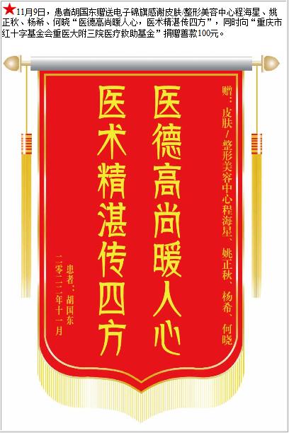 患者胡国东赠送电子锦旗感谢皮肤/整形美容中心程海星等人,并向医疗救助基金捐赠善款100元-锦旗-患者心声-患者服务-重庆医科大学附属第三医院【官方网站】