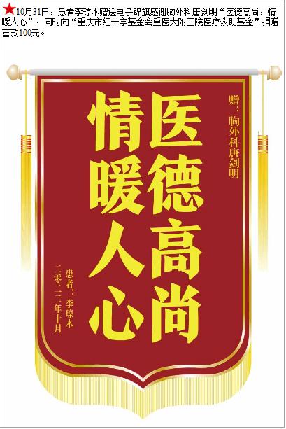 患者李琼木赠送电子锦旗感谢胸外科唐剑明,并向医疗救助基金捐赠善款100元-锦旗-患者心声-患者服务-重庆医科大学附属第三医院【官方网站】
