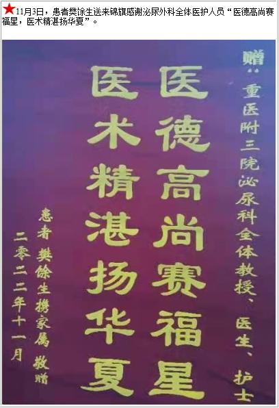 患者樊馀生送来锦旗感谢泌尿外科全体医护人员“医德高尚赛福星,医术精湛扬华夏”-锦旗-患者心声-患者服务-重庆医科大学附属第三医院【官方网站】