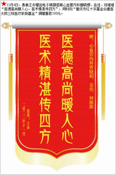患者王永赠送电子锦旗感谢心血管内科曾晓娟等人,并向医疗救助基金捐赠善款100元-锦旗-患者心声-患者服务-重庆医科大学附属第三医院【官方网站】