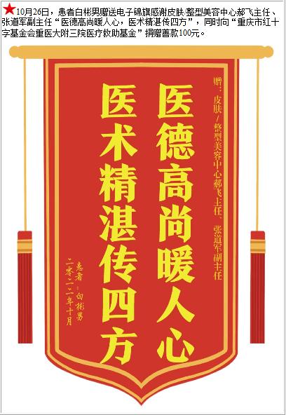 患者白彬男赠送电子锦旗感谢皮肤/整型美容中心郝飞主任等人,并向医疗救助基金捐赠善款100元-锦旗-患者心声-患者服务-重庆医科大学附属第三医院【官方网站】