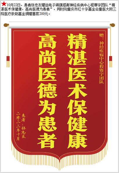 患者张忠友赠送电子锦旗感谢神经疾病中心程赛宇团队,并向医疗救助基金捐赠善款200元-锦旗-患者心声-患者服务-重庆医科大学附属第三医院【官方网站】