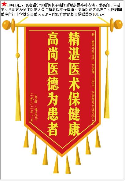 患者谭定华赠送电子锦旗感谢泌尿外科支轶等人及全体医护人员,并向医疗救助基金捐赠善款100元-锦旗-患者心声-患者服务-重庆医科大学附属第三医院【官方网站】