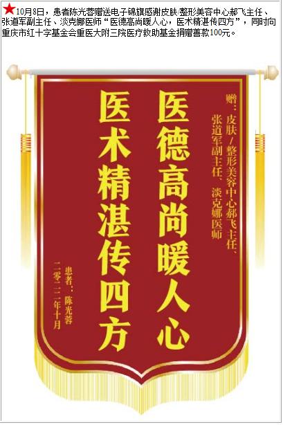 患者陈光蓉赠送电子锦旗感谢皮肤/整形美容中心郝飞主任等人,并向医疗救助基金捐赠善款100元-锦旗-患者心声-患者服务-重庆医科大学附属第三医院【官方网站】
