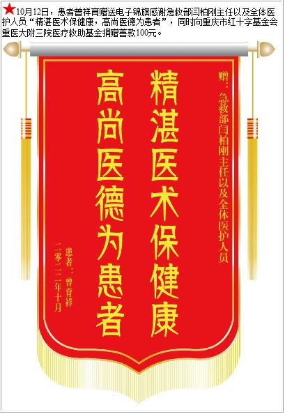 患者曾祥育赠送电子锦旗感谢急救部闫柏刚主任以及全体医护人员,并向医疗救助基金捐赠善款100元-锦旗-患者心声-患者服务-重庆医科大学附属第三医院【官方网站】