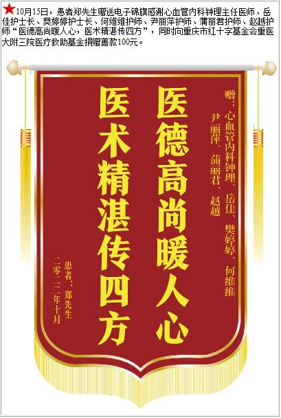 患者郑先生赠送电子锦旗感谢心血管内科钟理主任医师等人,并向医疗救助基金捐赠善款100元-锦旗-患者心声-患者服务-重庆医科大学附属第三医院【官方网站】