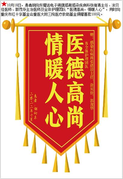 患者胡向东赠送电子锦旗感谢感染疾病科张绪清主任等人及全体护理团队,并向医疗救助基金捐赠善款100元。-锦旗-患者心声-患者服务-重庆医科大学附属第三医院【官方网站】