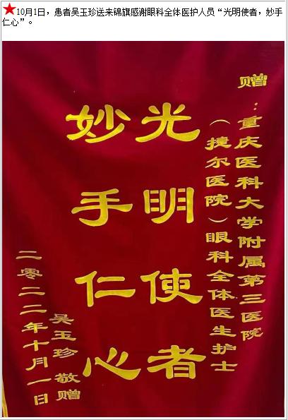 患者吴玉珍送来锦旗感谢眼科全体医护人员“光明使者,妙手仁心”-锦旗-患者心声-患者服务-重庆医科大学附属第三医院【官方网站】