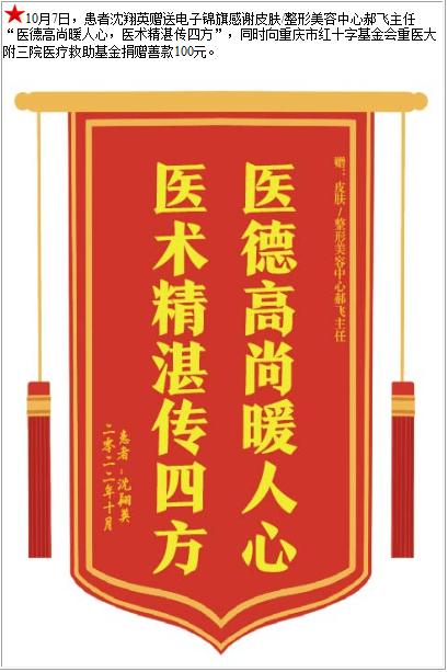 患者沈翔英赠送电子锦旗感谢皮肤/整形美容中心郝飞主任,并向医疗救助基金捐赠善款100元-锦旗-患者心声-患者服务-重庆医科大学附属第三医院【官方网站】