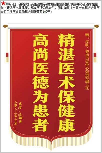 患者沈翔英赠送电子锦旗感谢皮肤/整形美容中心张道军副主任,并向医疗救助基金捐赠善款100元-锦旗-患者心声-患者服务-重庆医科大学附属第三医院【官方网站】