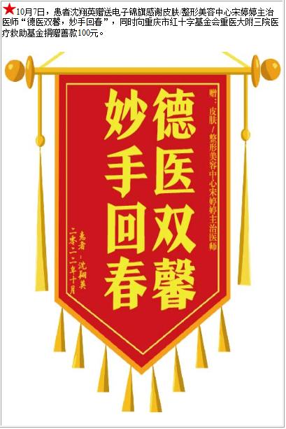 患者沈翔英赠送电子锦旗感谢皮肤/整形美容中心宋婷婷主治医师,并向医疗救助基金捐赠善款100元-锦旗-患者心声-患者服务-重庆医科大学附属第三医院【官方网站】