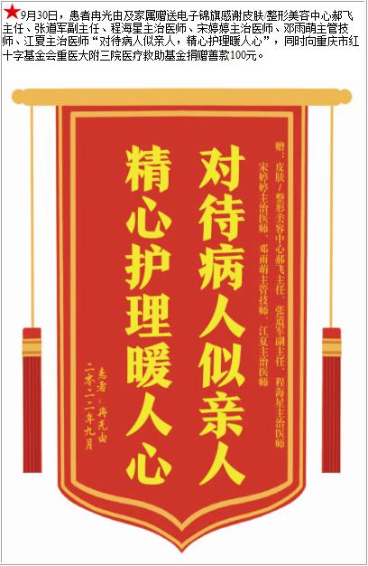 患者冉光由及家属赠送电子锦旗感谢皮肤/整形美容中心郝飞主任等人,并向医疗救助基金捐赠善款100元-锦旗-患者心声-患者服务-重庆医科大学附属第三医院【官方网站】