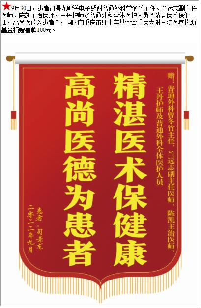 患者司景龙赠送电子感谢普通外科曾冬竹主任等人及普通外科全体医护人员,并向医疗救助基金捐赠善款100元-锦旗-患者心声-患者服务-重庆医科大学附属第三医院【官方网站】